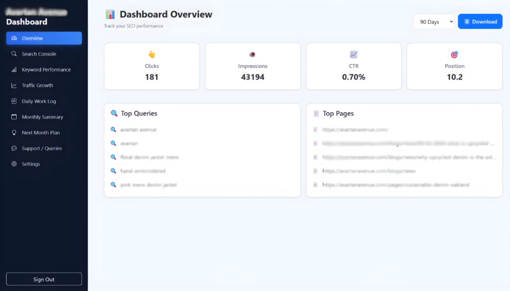 DigiGrowth tracks clicks, impressions, keyword rankings, and traffic trends in one dashboard, giving you a clear view of your growth.